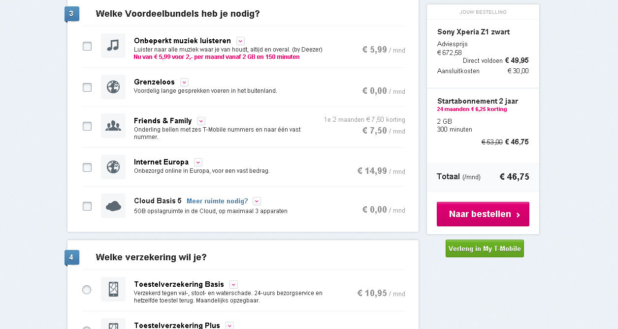 Wanneer je op de site van T-Mobile een aankoop wilt doen, tonen ze diverse aanvullende diensten die je kunt aanschaffen.